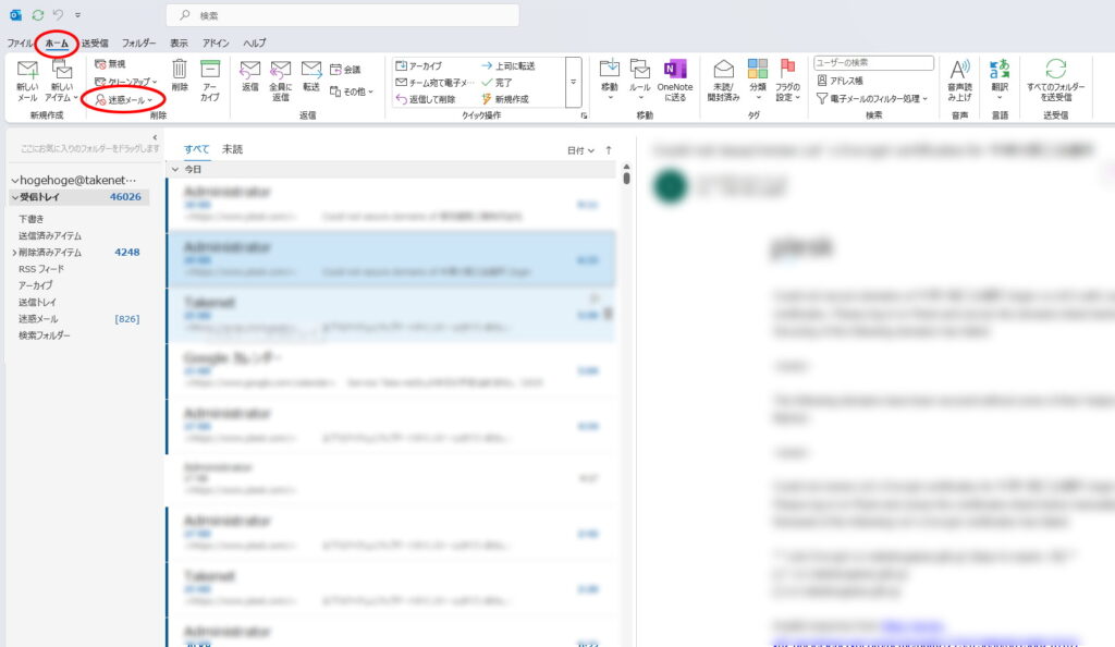 ②「ホーム」タブから「迷惑メール▼」をクリックします。