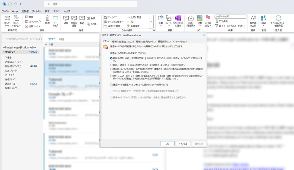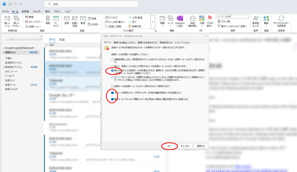 ④「オプション」タブ内の迷惑メールの処理レベルとオプションを選択しOKを押します。