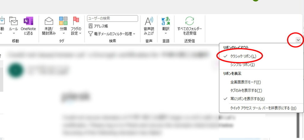 グループが表示されていない場合は、画面右上にある「▽」を押して「クラシックリボン」をクリックしてください。