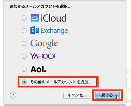 「メール」を起動し、「その他のメールアカウントを追加」にチェックを入れて【続ける】をクリックします