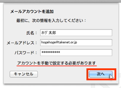 クリック後、“アカウントを手動で設定する必要があります”と表示されましたら「次へ」をクリックしてください。