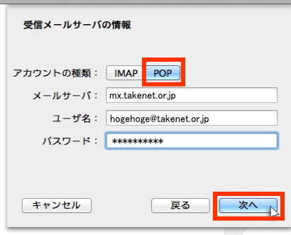 5.受信メールサーバの情報を入力